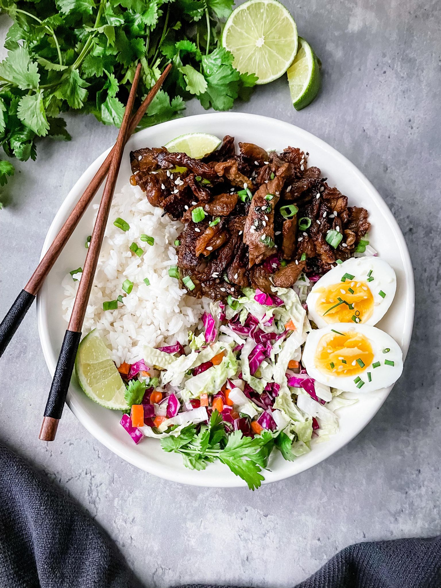 0 Make the beef bulgogi - recipe 1 In a large bowl, combine 2 cups of thinly sliced napa cabbage, 1 cup of thinly sliced purple cabbage, 1 large peeled and diced carrot, 2 thinly sliced green onions and 1/2 of a medium pear that has been diced small 2 In a small bowl, whisk 2 tablespoons of plain Greek yogurt, 2 tablespoons of rice wine vinegar, 2 teaspoons of honey, 1 tablespoon of fresh cilantro and a pinch of salt, black pepper and celery salt and add this to the slaw 3 Toss to combine 4 Divide the slaw between 2 shallow bowls 5 Add the cooked rice, soft boiled eggs and beef bulgogi 6 Garnish the bowls with finely chopped cilantro and lime wedgesView original recipe