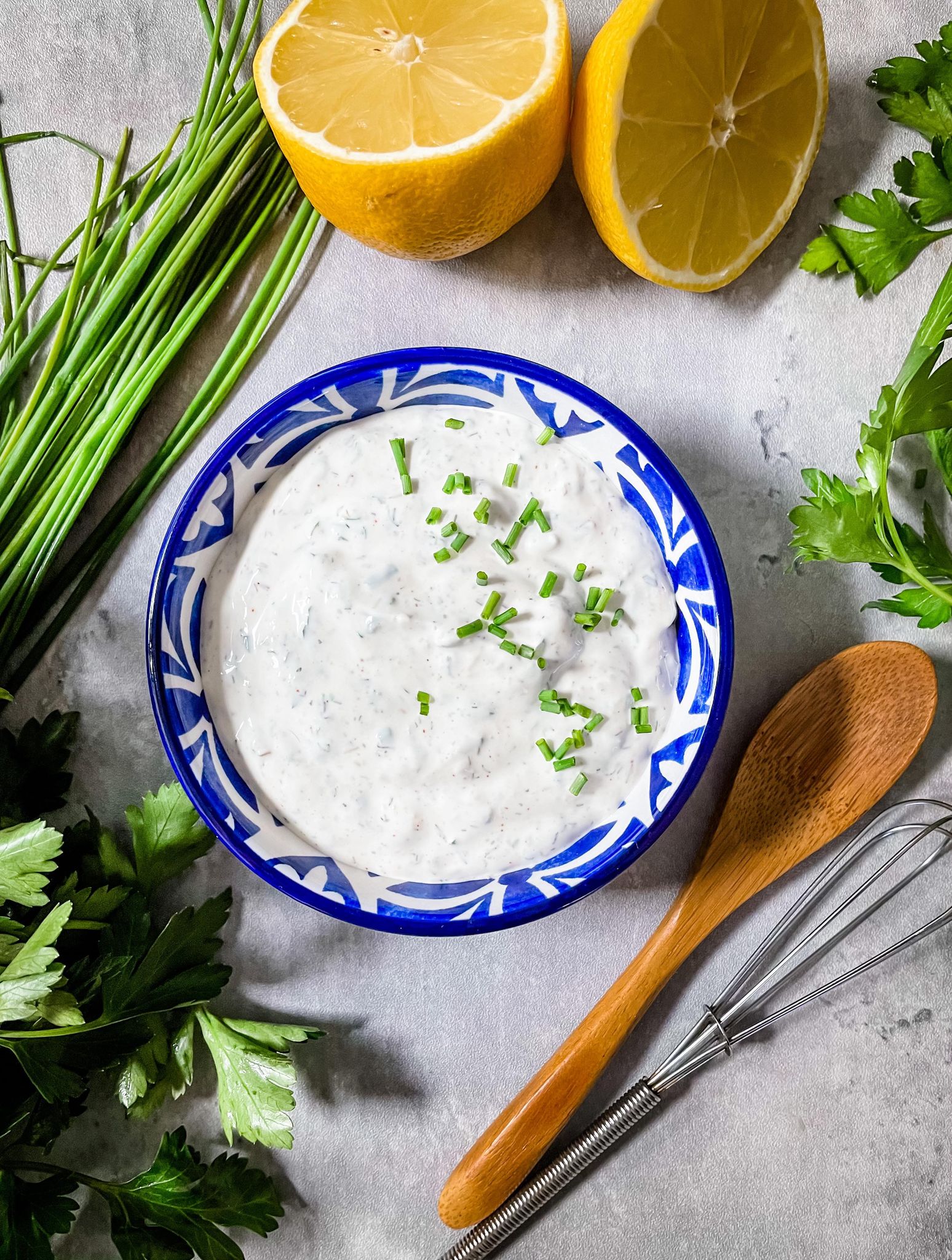 1 Combine 1/3 cup of plain greek yogurt, 1/3 cup of sour cream, 1/3 cup of mayonnaise, 1 teaspoon of fresh lemon juice, 1 finely grated clove of garlic, 1 tablespoon of finely chopped fresh chives, 1 tablespoon of finely chopped fresh parsley, 2 teaspoons of dried dill, 1/2 teaspoon of onion powder, a pinch of salt and black pepper and an optional pinch of paprika or dry mustard in a bowl 2 Add 1/4-1/2 cup of buttermilk to achieve your desired consistency 3 Whisk until all of the ingredients are fully combined 4 Serve immediately or chill in an airtight containerView original recipe
