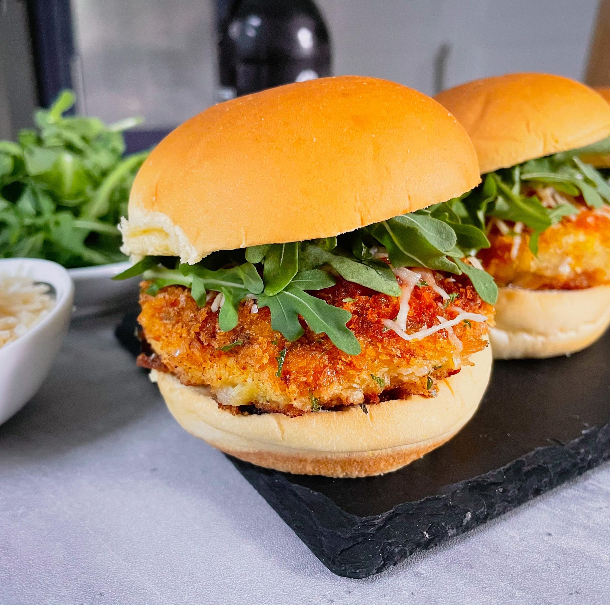 1 In the first shallow bowl, combine 1 cup of panko, 1/2 cup of parmesan, 1/2 teaspoon of garlic powder, 1/2 teaspoon of onion powder and a pinch of salt and black pepper 2 In a second shallow bowl, whisk 2 large eggs with 1 tablespoon of whole milk and season with salt and black pepper 3 In a third shallow bowl, add 1 cup of flour, season with salt and black pepper and set all three bowls aside 4 Thin slice the chicken breast into 4 portions 5 Season chicken with a pinch of garlic powder, onion powder, salt and black pepper 6 Place a large skillet over medium heat and add 3 tablespoons of olive oil and 3 tablespoons of butter to the skillet 7 One at a time, dust the chicken with flour, dip in the eggs and then coat with panko 8 Place the coated chicken in the skillet and cook without moving the chicken until the bottom is a deep golden brown 9 Flip the chicken and reduce the heat to medium low 10 Spoon a bit of marinara onto each chicken breast and top with shredded mozzarella or parmesan 11 Cover the skillet and continue to cook until the chicken is cooked through and the cheese is melted 12 Assemble sliders by adding marinara onto the base slider buns and placing one piece of chicken on each slider roll and topping with arugulaView original recipe