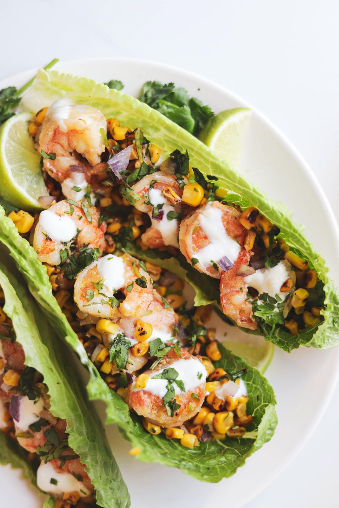 Make the grilled corn salsa... 0 Slice the corn kernels off of 2 ears of fresh sweet corn 2 Place a dry skillet over medium to medium high heat 3 Grill the corn until lightly charred 4 Transfer the charred corn into a large bowl along with 1/4 cup of finely diced red onion, 1/3 cup of finely chopped fresh cilantro, 1 small minced jalapeño, the juice of a large lime and a generous pinch of sea salt 5 Mix until evenly distributed and set aside Make the citrus crema... 7 Combine 1/2 cup of sour cream, plain greek yogurt or crema with a tablespoon of fresh citrus juice, 1 large clove of finely mined or grated garlic and a pinch of sea salt and set aside for now Make the citrus grilled shrimp... 9 Combine 1/3 cup of extra virgin olive oil with 2 tablespoons of fresh citrus juice, 2 teaspoons of fresh citrus zest, 2 teaspoons of honey or agave, 1 teaspoon of ginger, grated or pasted and a pinch of salt and black pepper and set aside for now 10 Pat the shrimp dry with a paper towel and season with salt and black pepper 11 Lightly oil your grill or a grill pan placed over medium to medium high heat 12 Grill the shrimp on one side until seared then carefully flip the shrimp and brush with the citrus mixture 13 Grill on the other side until seared and then flip and brush the other side with the citrus mixture 14 Repeat flipping and brushing with the citrus mixture until the shrimp is cooked through and generously glazed (6-8 minutes total) 15 Transfer the shrimp off of the heat Assemble the wraps... 17 Arrange romaine lettuce leaves on a platter and top with grilled corn salsa 18 Lay the citrus grilled shrimp over the salsa and drizzle with citrus cilantro crema 19 Garnish wraps with finely chopped cilantro and lime wedgesView original recipe