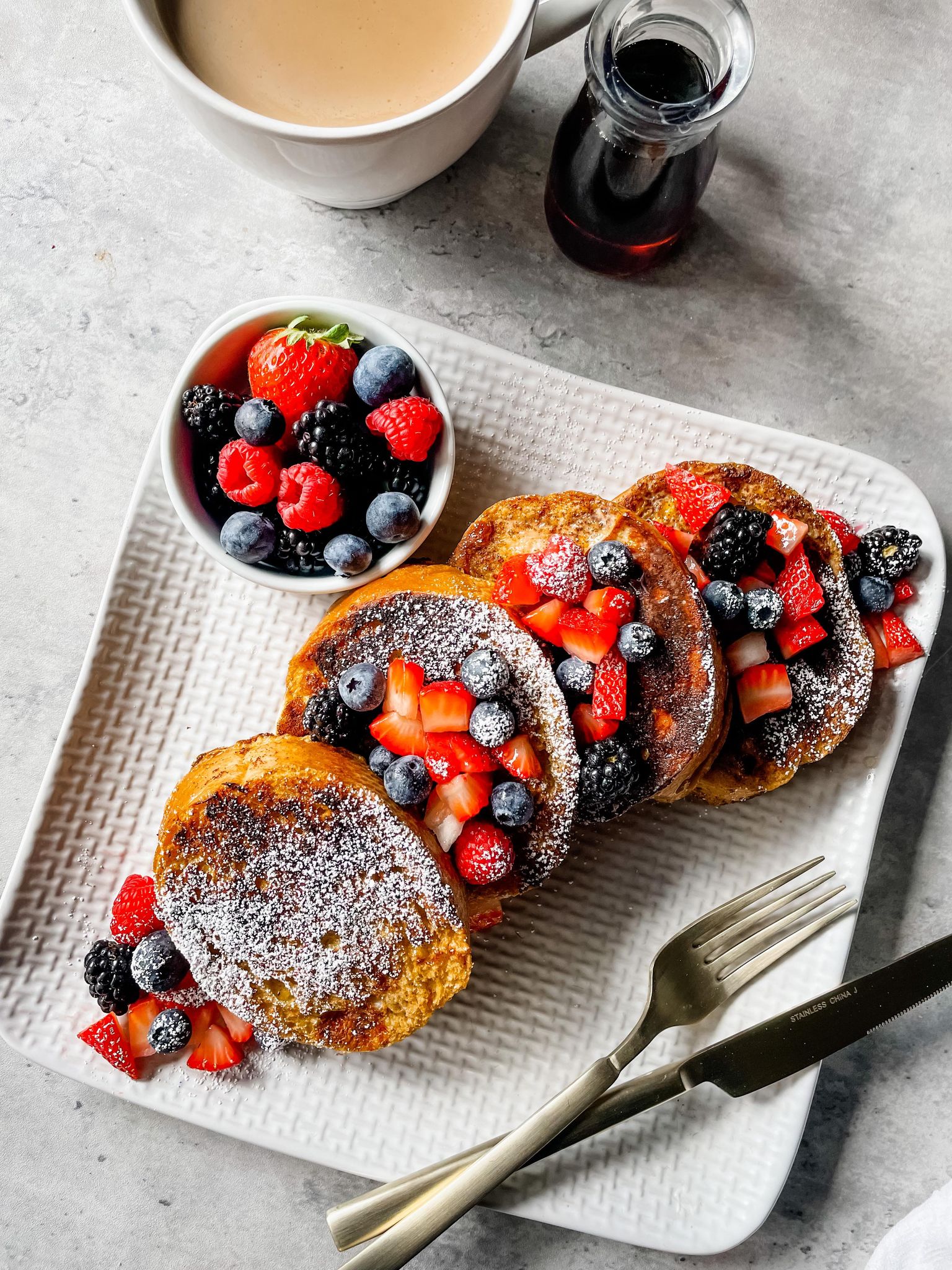 0 Combine 3 large eggs, 3 egg yolks, 1/2 cup of half and half, 2 tablespoons of granulated sugar, 2 teaspoons of cinnamon, 1/4 teaspoon of nutmeg, a pinch of salt and 2 teaspoons of vanilla extract in a shallow bowl and whisk until fully combined 1 Place a wide skillet or flat griddle over medium heat and grease with butter or non-stick spray 2 Soak the bread for about 30 seconds per side in the egg mixture and transfer onto the warm, greased griddle 3 Cook for about 2 minutes on the first side and once the underside is golden brown, flip the bread and cook for another 2 minutes or until both sides are golden brown and lightly caramelized 4 Transfer the french toast onto plates, top with fresh fruit and a dusting of confectioners sugar 5 Serve warm with maple syrupView original recipe