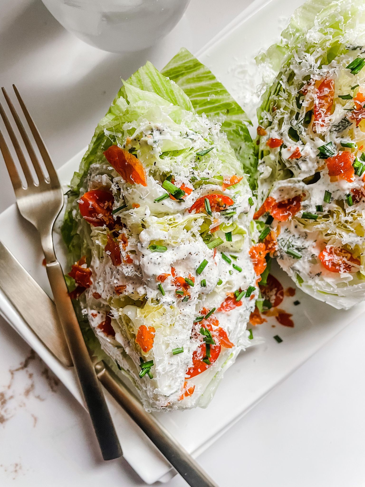 0 Preheat your oven to 400 degrees 1 Place your bacon or prosciutto on a non-stick or parchment lined baking sheet and bake until crispy 2 Transfer the bacon or prosciutto onto a paper towel lined plate until ready to use 3 Make the dressing by combining 1/2 cup mayonnaise, 1/2 cup sour cream, 1 small clove of crushed garlic, 1/4 teaspoon of onion powder, 1/4 teaspoon of celery salt, 1/4 teaspoon of dried cilantro, 1/4 teaspoon of dried parsley, 1/4 teaspoon of salt, a pinch of black pepper and a tablespoon of finely chopped fresh dill. Thin the dressing, if necessary, with a splash of buttermilk, milk or a squeeze of lemon juice 8 Remove the top two layers from the head of iceberg and cut into wedge shaped quarters 9 Rinse each wedge under cold water and then transfer onto a paper towel lined plate to drain and pat dry with paper towels 13 Drizzle each wedge with dressing and top with crumbled bacon or prosciutto, quartered tomatoes and shredded cheese 14 Garnish with finely chopped chives or parsley and fresh cracked pepper (optional)View original recipe