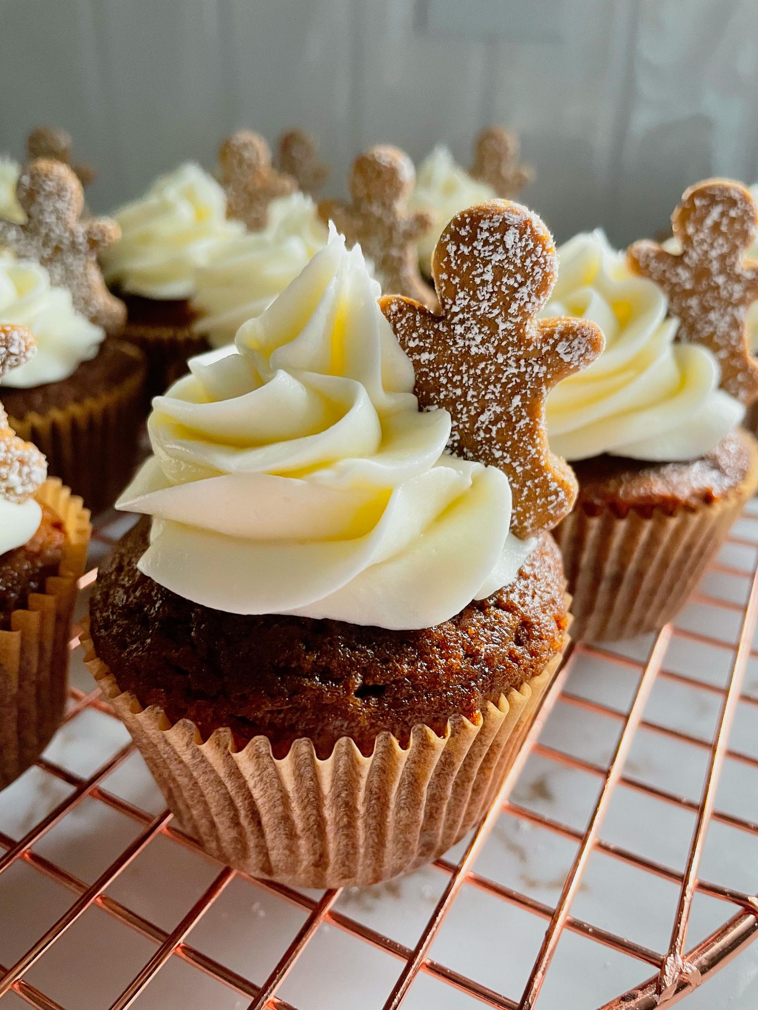 0 Preheat your oven to 350 degrees 1 Cream together 8 tablespoons of room temperature butter with 2/3 cup of brown sugar, 1/2 cup of molasses and 1 large egg in a large bowl using an electric hand mixer or stiff whisk 2 Add 2/3 cup of whole milk and 2 teaspoon of vanilla extract and mix to combine 3 Combine 1 1/2 cups of all purpose flour, 1/2 teaspoon of baking powder, 1/2 teaspoon of baking soda, 1/4 teaspoon of salt, 1 1/2 teaspoon of ground cinnamon, 1 teaspoon of ground ginger, 1/2 teaspoon of ground nutmeg, 1/4 teaspoon of ground cloves, 1/4 teaspoon of all spice and 1 teaspoon of fresh lemon zest (optional, but recommended) and add it into the remaining ingredients 4 Mix until all ingredients are fully incorporated 5 Grease of line a 12 cup cupcake tin 6 Fill each cavity 2/3 of the way 7 Bake on the middle rack of a 350 degree oven for 18-20 minutes or until a toothpick comes out of the middle of a cupcake clean 8 Transfer the cupcakes onto a cooling rack to cool fully before frosting 9 While the cupcakes cool, make the frosting by creaming together 8 ounces of room temperature cream cheese with 8 tablespoons of room temperature butter using an electric hand mixer or stand mixer 10 Add 1 tablespoon of vanilla extract and a pinch of salt and mix to combine 11 Add about 3 cups of confectioners sugar, a little at a time, continuing to cream the frosting as you add more 12 Once the cupcakes are cool, top them with frosting and a little gingerbread man and enjoy! 13 Store leftovers in an airtight container at room temperatureView original recipe