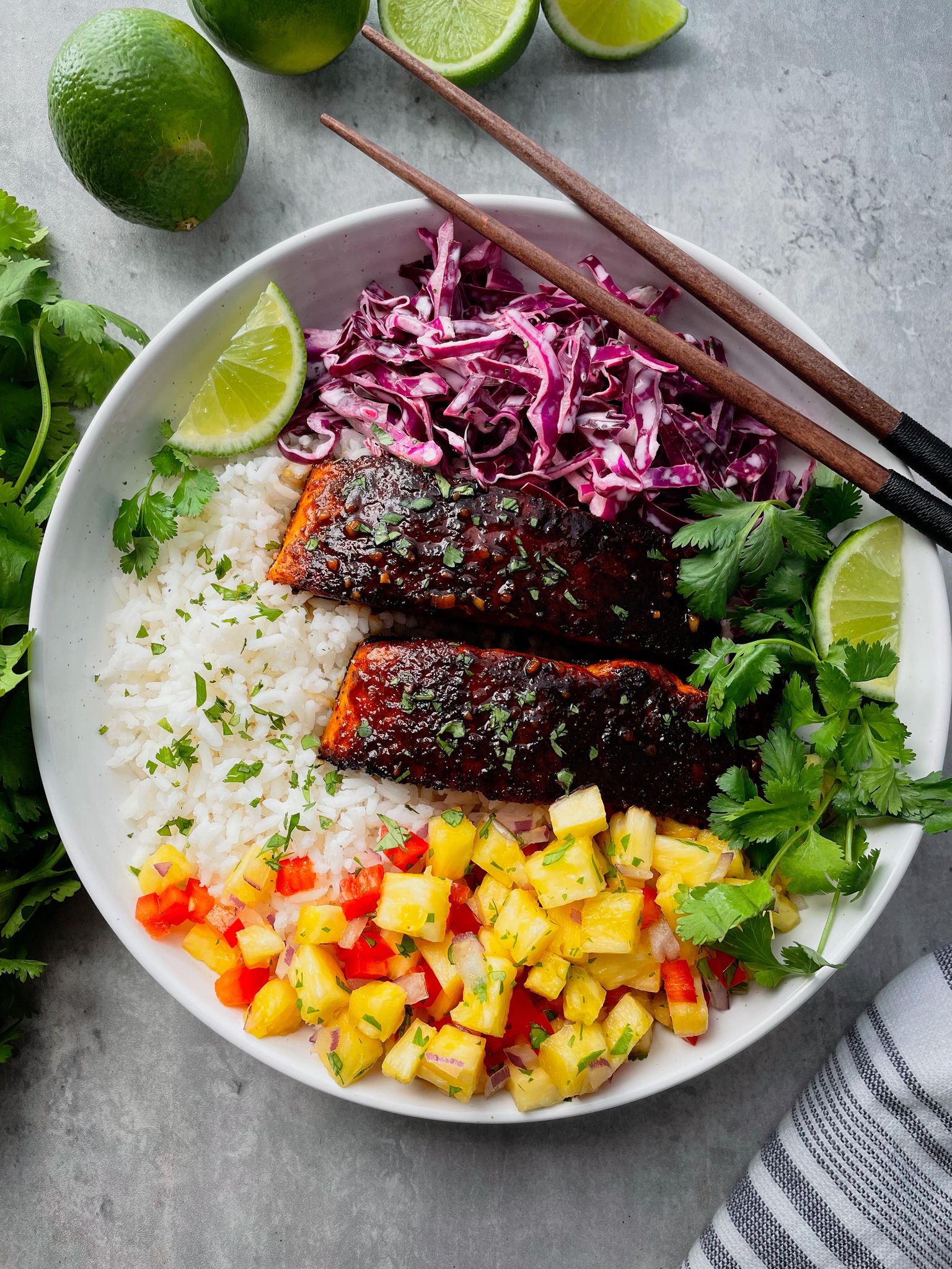 0 Begin by cooking 1 1/2 cups of white rice according to the manufacturers directions Make the pineapple salsa... 2 In a medium bowl, combine 1 cup of fresh diced pineapple with 1/2 of a small minced sweet bell pepper, 1/4 cup of minced red onion, 2 tablespoons of finely chopped fresh cilantro, 1 tablespoon of fresh lime juice and a pinch of salt and tajin seasoning and set aside for now Make the citrus slaw... 4 In a medium bowl, toss 1 cup of thinly sliced cabbage (red or green) with 1 tablespoon of plain Greek yogurt, 1 tablespoon of fresh lime juice and a pinch of salt, black pepper and celery salt Make the pineapple glazed salmon... 6 Pat 2 salmon filets dry with paper towels and season them generously with seasoned salt 7 Add 1 tablespoon of extra virgin olive oil into a skillet and place it over medium heat 8 Once the skillet is warm, place the salmon skin side up into the skillet and let is cook undisturbed for 4 minutes or until the underside is crisp and golden brown 9 While the salmon is cooking, whisk 1/2 cup of fresh pineapple juice with 2 tablespoons of soy sauce and 1 teaspoon of crushed garlic in a small bowl 10 Once the underside is crisp and golden brown, flip the salmon and pour the pineapple glaze into the skillet 11 Cook the salmon, occasionally spooning the pineapple glaze over the salmon, until it is done to your liking 12 Once the salmon is done, remove the skillet from the heat to prevent the glaze from burning Assemble the bowls... 13 Divide the rice between two shallow bowls 15 Add half of the pineapple salsa and citrus slaw into each bowl 16 Add the crispy glazed salmon into the bowls and garnish with finely chopped cilantro and lime wedges 17 Enjoy!View original recipe