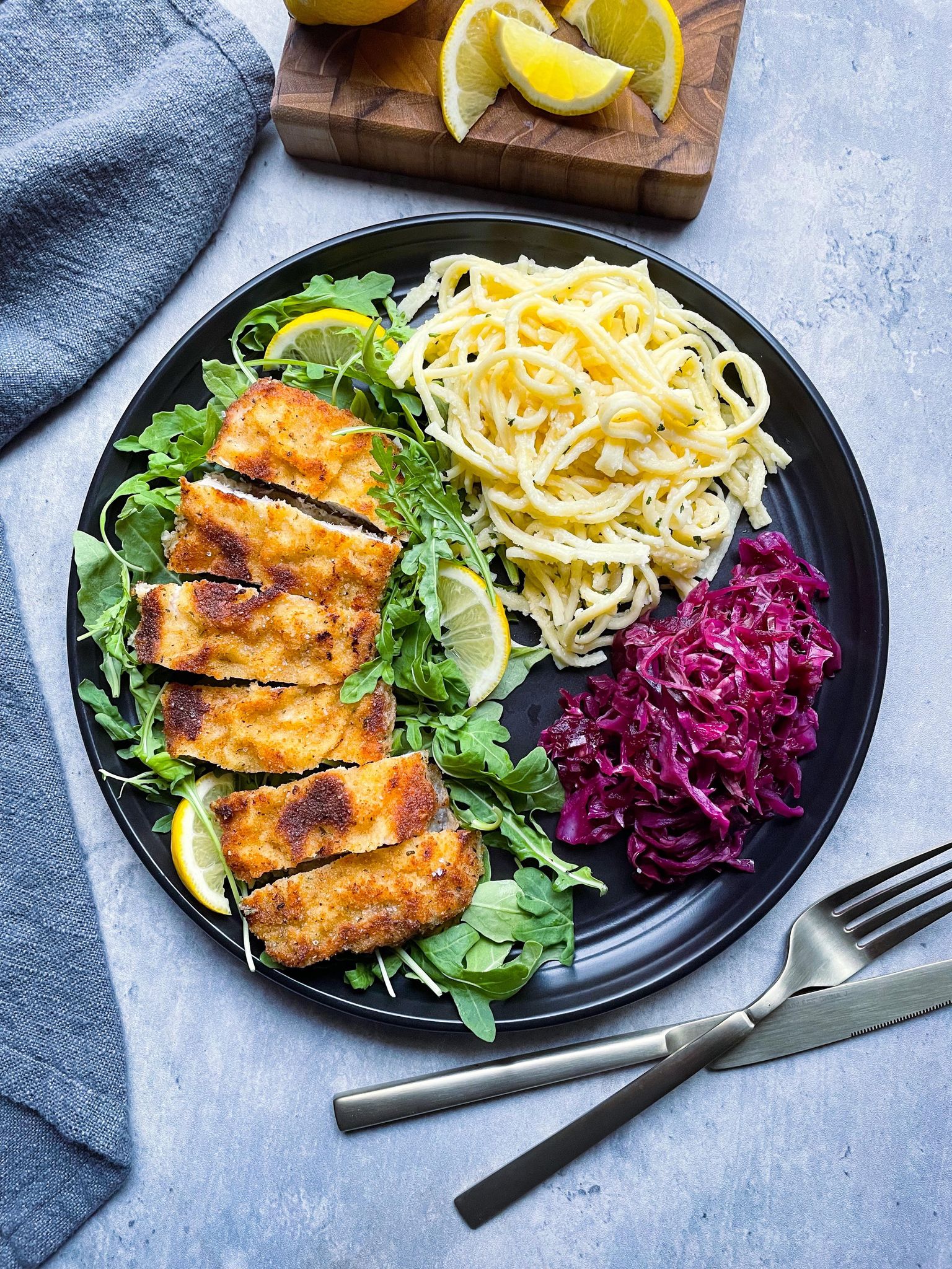 0 Pound the pork to about 1/4 inch thickness, using a meat tenderizer 1 Add 1/2 cup of flour to a shallow bowl and season with salt and pepper 2 Whisk 1 egg with 1 tablespoon of milk in a second shallow bowl, season with salt and black pepper and whisk until smooth 3 Add 3/4 cup of breadcrumbs into a third shallow bowl 4 Dip each piece of pork into the flour until the surface is lightly coated 5 Then dip each flour coated piece of pork into the eggs and allow any excess to return to the bowl 6 Dip the flour and egg coated pork into the breadcrumbs ensuring that all sides are coated with breadcrumbs 7 Add 3 tablespoons of butter and 3 tablespoons of oil into a large skillet 8 Place the skillet over medium heat 9 Once the butter and oil have melted and combined, add the coated pork leaving some space in between each piece 10 Allow the first side to cook for 2-3 minutes or until the bottom is golden and cripsy 11 Carefully flip each piece over and cook until both sides and golden and crispy 12 Transfer the cooked schnitzel onto a paper towel lined plate for a minute or so before plating 13 Serve warm with potato salad and rotkohl and garnish with lemon wedgesView original recipe