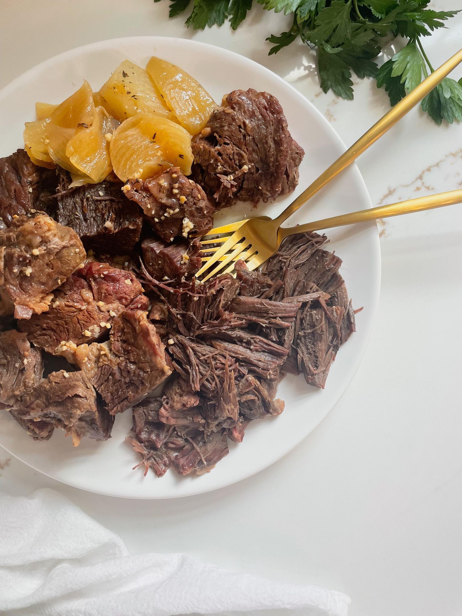 0 Slice the roast into 2 inch cubes and generously season with sea salt, black pepper and dried Italian herbs 1 Place the seasoned beef into an instapot or pressure cooker along with the onion and garlic 2 Pressure cook on high for 15-20 minutes per pound (50 minutes is suggested for a 3 pound roast) 3 Shred the beef and enjoy!View original recipe
