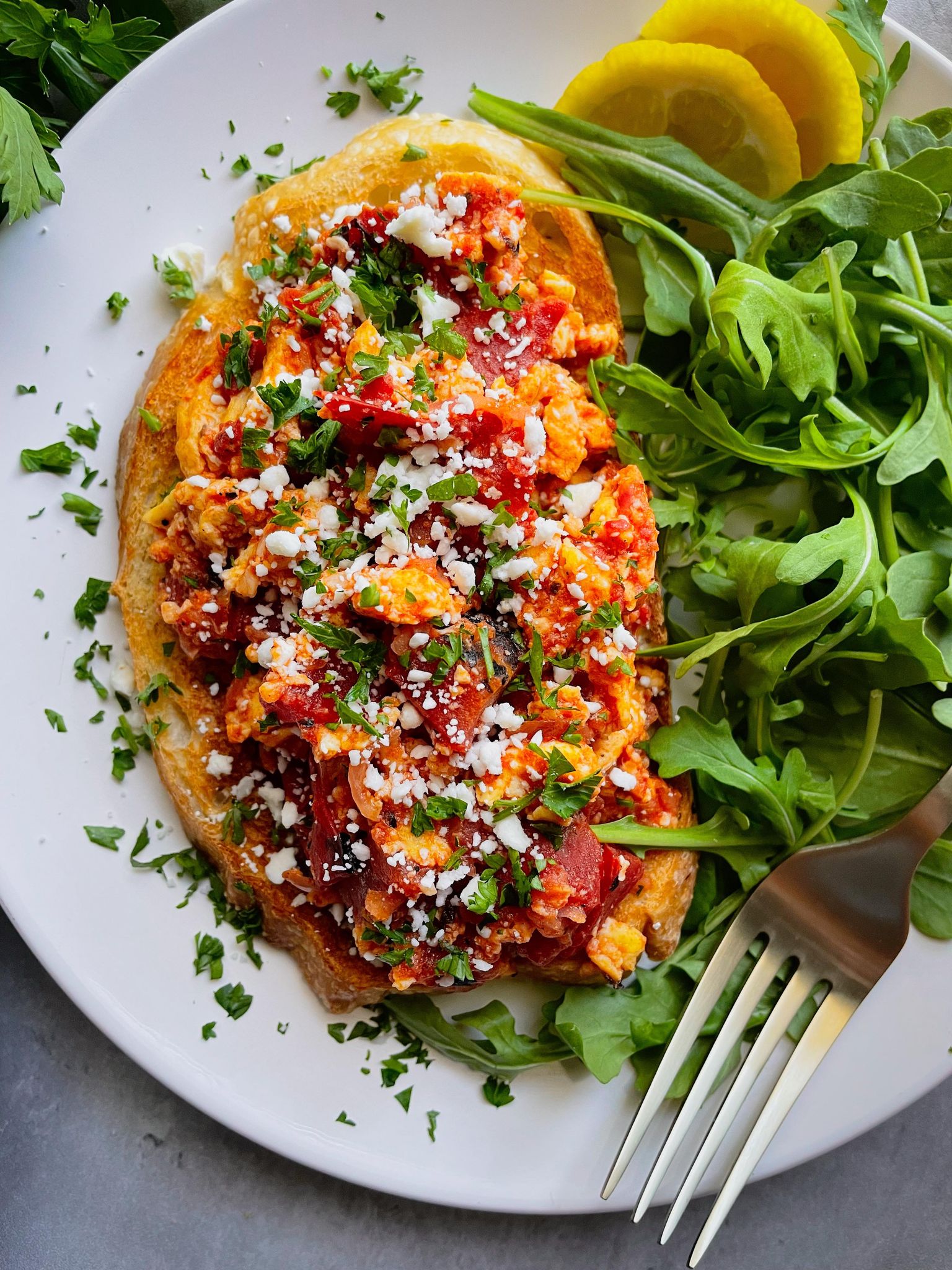 0 Place a large non-stick over medium heat 1 Add 2 tablespoons of extra virgin olive oil along with the grated red onion and garlic into the skillet and cook for 2 minutes stirring consistently 2 Add 15 ounces of diced tomatoes, 1/4 teaspoon of dried oregano and a big pinch of salt and black pepper and stir to combine 3 Bring the mixture to a low simmer 4 In a small dish, whisk 4 eggs and season with salt and black pepper 5 Push the tomato mixture to one half of the skillet and add the whisked eggs to the other half 6 Cook the eggs, stirring occasionally, until they are soft scrambled 7 Stir to combine the scrambled eggs with the tomato mixture 8 Spoon the eggs over crusty bread and top with crumbled feta and fresh parsley or basil 9 Enjoy!View original recipe