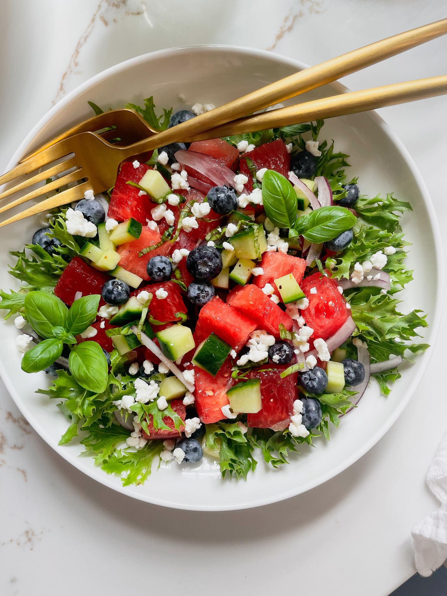 0 Combine the watermelon, cucumber, blueberries, red onion, feta and fresh basil leaves in a large bowl 1 In a small bowl, whisk 2 tablespoons of honey with 2 tablespoons of fresh lime juice and a pinch of sea salt and black pepper until combined 2 Drizzle the dressing over the watermelon mixture and toss until incorporated 3 Enjoy!View original recipe